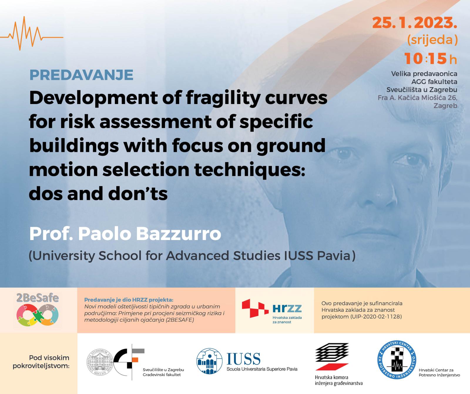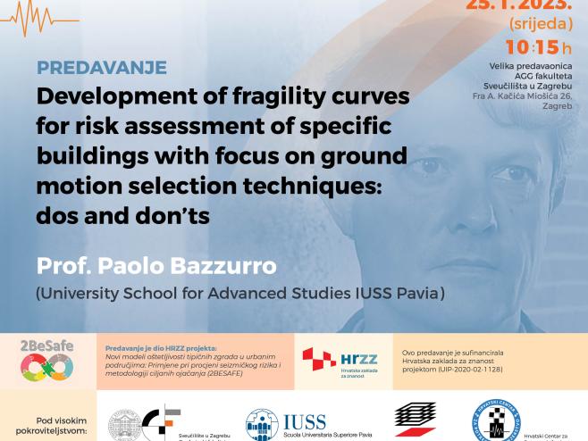 Predavanje pod nazivom 'Development of fragility curves for risk assessment of specific buildings with focus on ground motion selection techniques: dos and don'ts' održano je 25. siječnja 2023. u 10:15 sati u Velikoj predavaonici, Kačićeva 26 uživo te na daljinu: https://2besafe.grad.hr/lecture-of-prof-paolo-bazzurro/.