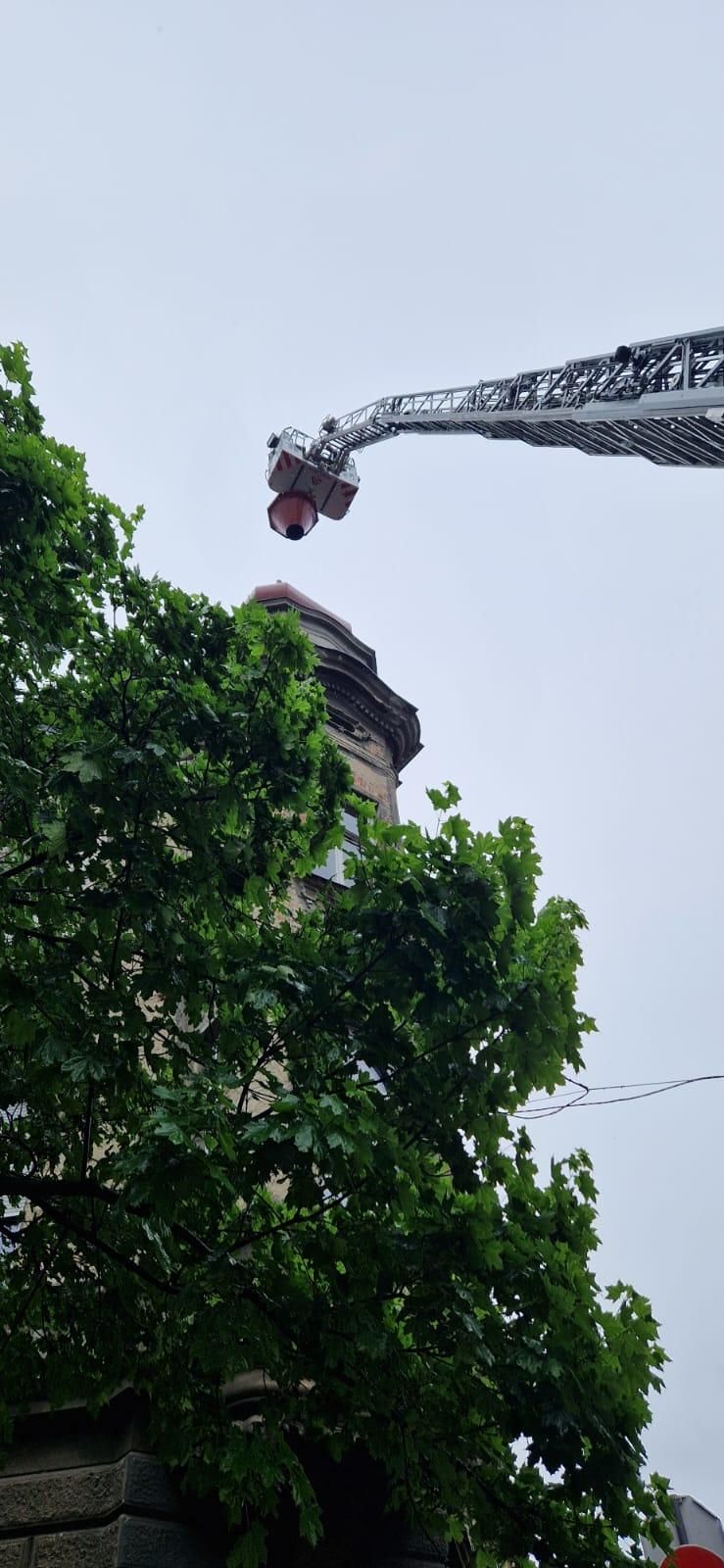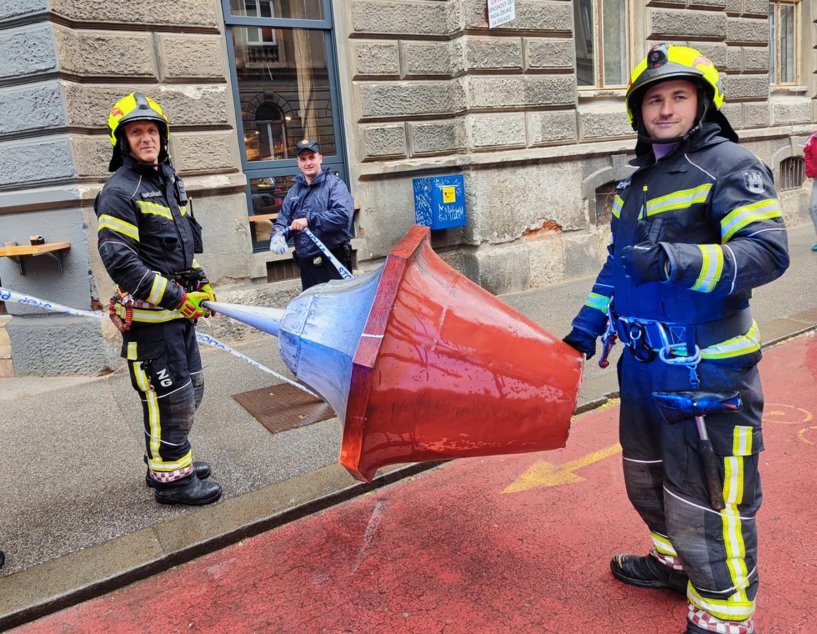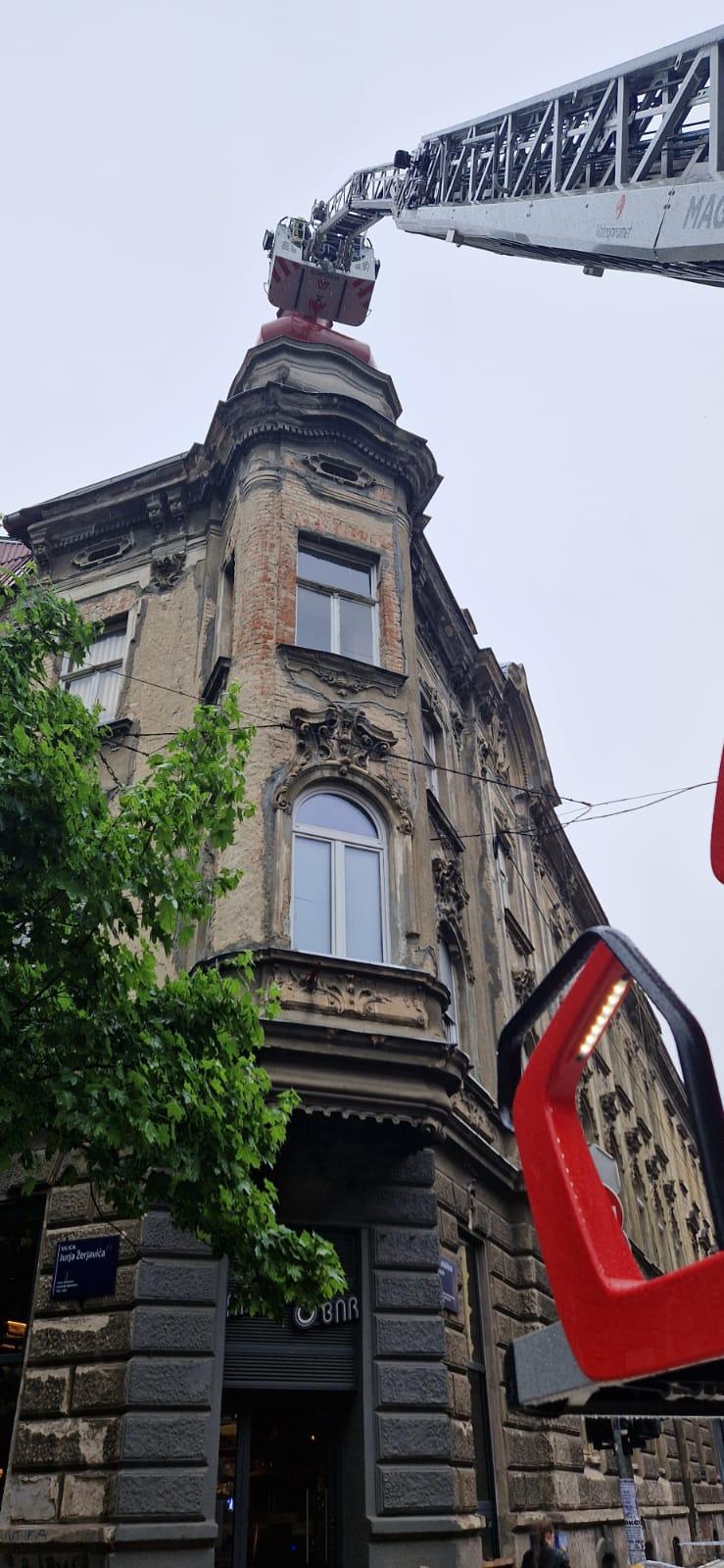 Nakon pregleda iz vatrogasne košare labilni je dio limene krovne kape putem užadi sigurno uklonjen i spušten na tlo.