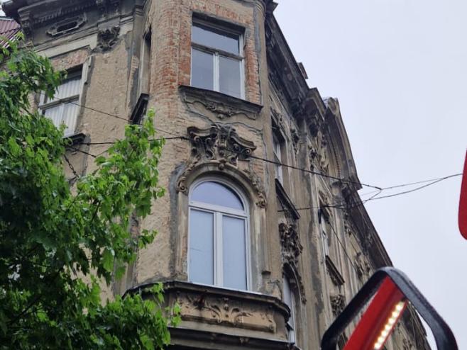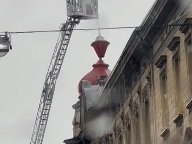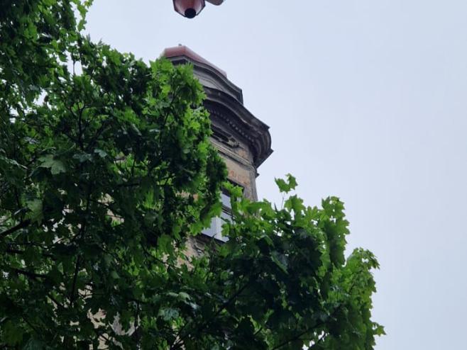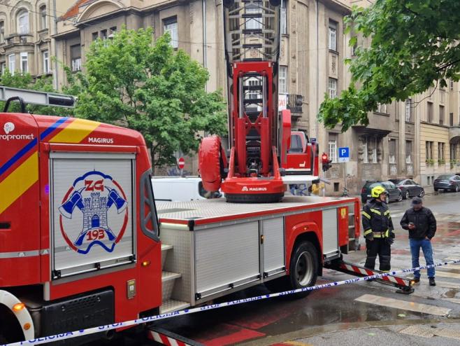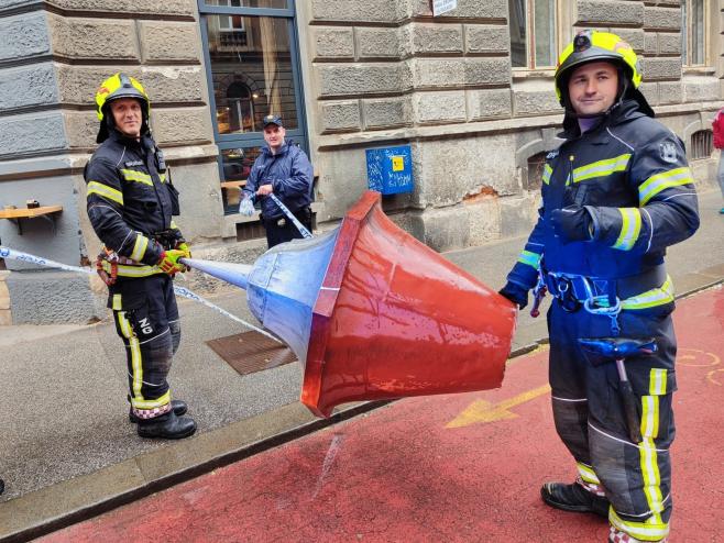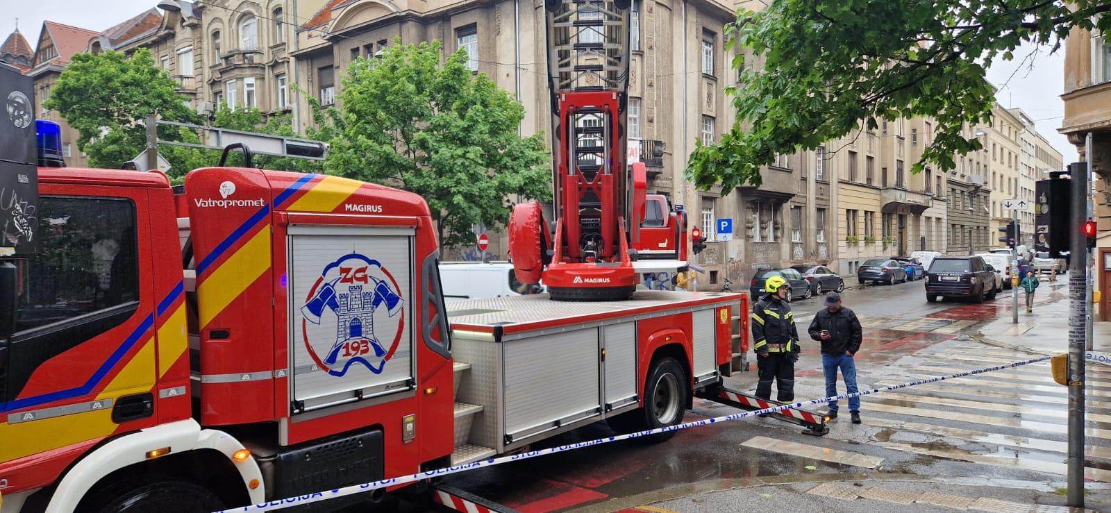 Nakon pregleda iz vatrogasne košare labilni je dio limene krovne kape putem užadi sigurno uklonjen i spušten na tlo.
