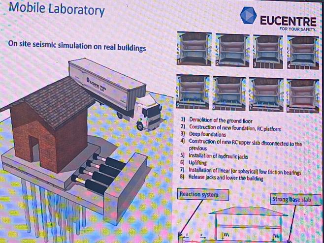 Posjetili smo testne laboratorije europskog centra za podučavanje i istraživanje na području potresnog inženjerstva, znanog pod imenom EUCENTRE, smještenog nedaleko Milana, u gradu Pavia. Tu su predstavljeni modeli građevina na dva velika potresna stola. Prikazan je primjer ispitivanja lastavice do sloma, uz simulaciju ubrzanja i opterećenja krovne konstrukcije. Drugi je primjer toranj ispitan isaac aktivnim prigušivačem. Vrijedno je znati kako EUCENTRE nudi besplatna ispitivanja istraživačima koji imaju dovoljno zanimljiv problem, a što se utvrđuje putem podnošenja zahtjeva i revizije istog.