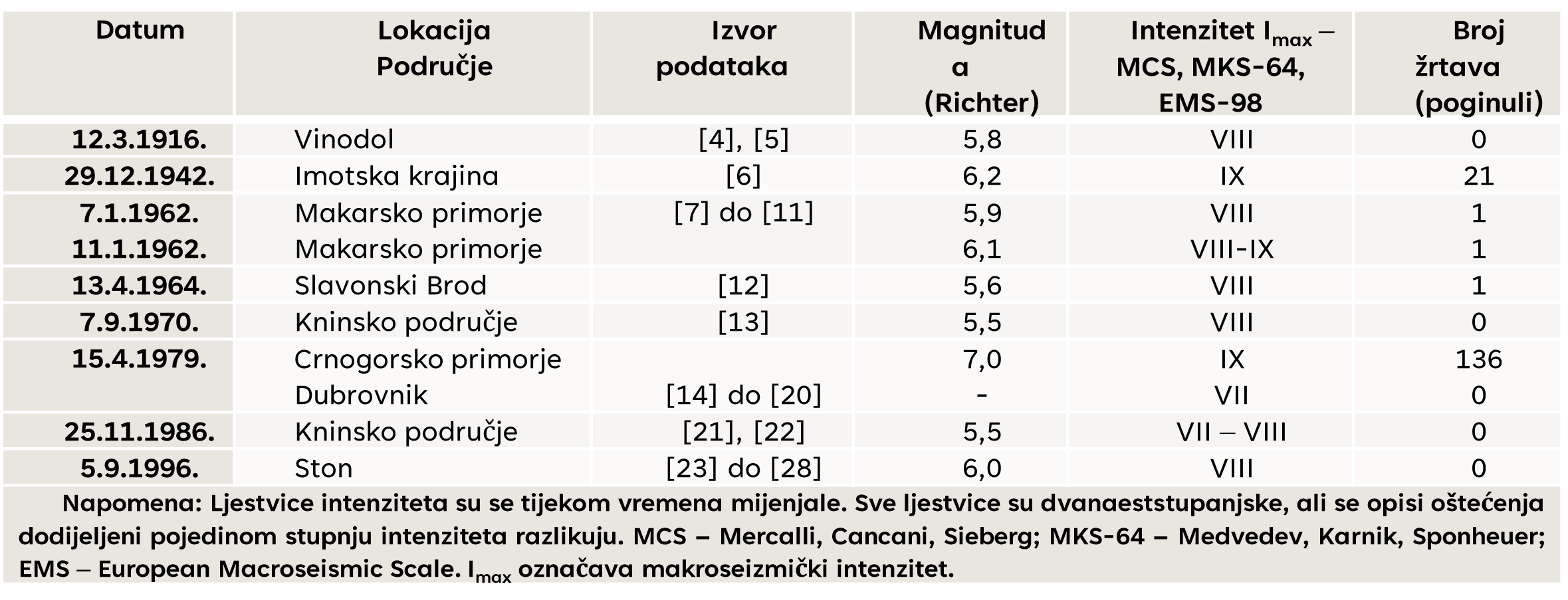 Zagrebački potres 22. ožujka 2020. potaknuo je istraživanje učinaka prethodnih razornih potresa koji su pogodili područja Hrvatske u dvadesetom stoljeću. Ti su potresi dobro poznati seizmolozima, a znatno manje građevinskim inženjerima. Osim prvoga u 20. stoljeću (Pokupsko, 8. listopada 1909.) na osnovi kojega je Mohorovičić došao do epohalnih otkrića o unutrašnjosti Zemlje, jedan je zaboravljen (Vinodol, 1916.), drugi je gotovo nepoznat (Imotski, 1942.), a treći je ostao u kolektivnom pamćenju stanovnika kao prekretnica u razvitku područja (Makarsko primorje, 1962.). Za ostale postoje više ili manje jasna prisjećanja starijih generacija. U tablici 1 navedeni su razorni potresi koji su pogodili područje Hrvatske u razdoblju od 1916. do 1996. godine.