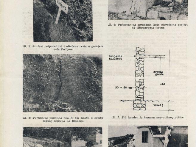 Tipične zgrade u selima i zaseocima koje su najviše oštećene ili urušene bile su prizemne kamene kuće na kamenim temeljnim zidovima zidanim u slabom vapnenom mortu i sa slabo popunjenim šupljinama između dvaju slojeva zida. Stropne konstrukcije su drveni grednici slobodno položeni i nepovezani sa ziđem. Krovišta su drvena od neuredno spajanih dijelova s teškim pokrovom od kamenih ploča ili kupa. Slabo povezani zidovi rasklapali su se tako da su najveći pomaci bili pri njihovu vrhu.