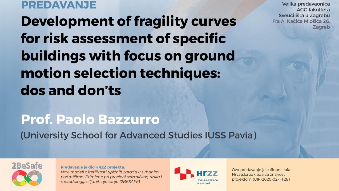 Predavanje pod nazivom 'Development of fragility curves for risk assessment of specific buildings with focus on ground motion selection techniques: dos and don'ts' održano je 25. siječnja 2023. u 10:15 sati u Velikoj predavaonici, Kačićeva 26 uživo te na daljinu: https://2besafe.grad.hr/lecture-of-prof-paolo-bazzurro/.