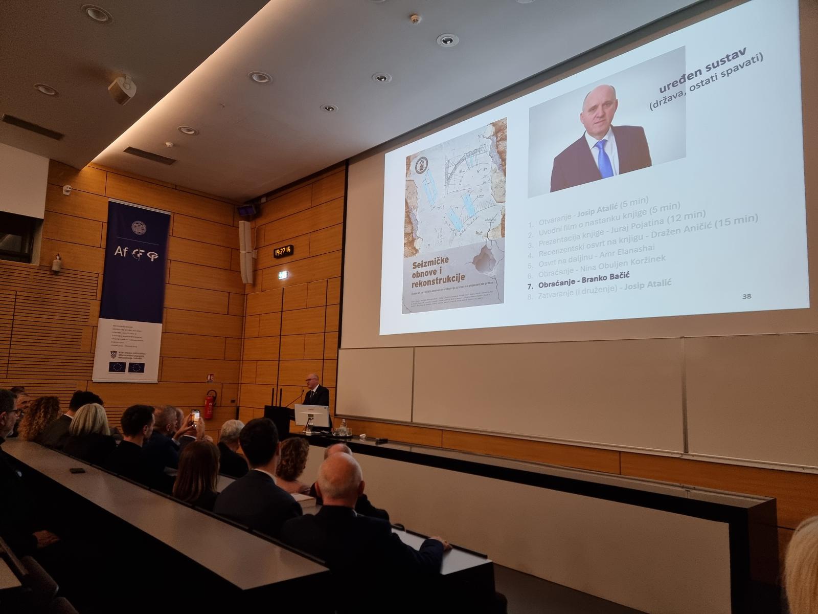 Tijek promocije započeo je uvodnim obraćanjem predsjednika HCPI-ja, prof. dr. sc. Josipa Atalića. Nakon toga, glavni urednik Juraj Pojatina je, uz prikaz kratkog uvodnog filma, predstavio proces nastanka knjige, naglašavajući složenost koordinacije i objedinjavanja stručnog znanja. Recenzijski osvrt na knjigu dao je prof. dr. sc. Dražen Aničić, ističući njezinu sveobuhvatnost i referentnu vrijednost za inženjersku praksu, dok su se putem videa obratili i profesor Miha Tomaževič i Amra Elanashaia. Predstavljanju su nazočili visoki dužnosnici Vlade RH: potpredsjednik Vlade i ministar prostornoga uređenja, graditeljstva i državne imovine, Branko Bačić, te ministrica kulture i medija, dr. sc. Nina Obuljen Koržinek. Ministar Bačić istaknuo je važnost aktivnog sudjelovanja projektanata u kreiranju regulativa i tehničkih propisa u provedbi obnove. Ministrica Obuljen Koržinek naglasila je da ova knjiga osigurava prijenos znanja hrvatskih stručnjaka i dokazuje da je, u suradnji s HCPI-jem, ostvaren povijesni poduhvat obnove kulturne baštine primjenom inovativnih pristupa i najnovijih znanstvenih spoznaja, čime je značajno podignuta protupotresna otpornost zgrada uz puno poštivanje očuvanja povijesnih struktura.