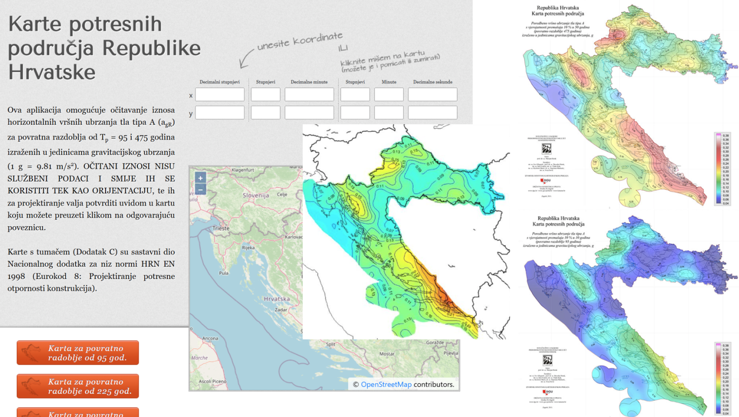 Iznosi maksimalnog horizontalnog ubrzanja tla (ag) tijekom potresa za povratno razdoblje Tr = 225 godina procijenjeni su za svako mjesto na karti prema iznosima ag za povratna razdoblja od 95 i 475 godina koji su objavljeni na kartama potresnih područja u Nacionalnom dodatku Eurokodu-8. Pri tome su se koristile odredbe članka 2.1 (4) navedene norme koje definiraju multiplikativni faktor kojim valja pomnožiti referentne iznose ag (npr. za povratno razdoblje od 475 godina, agR) ako ih želimo svesti na neko drugo povratno razdoblje. Pri tome je trebalo prvo izračunati za svaku točku na karti odgovarajući iznos koeficijenta k koji ovisi o seizmičnosti uokolo pojedine točke, tako da odgovara omjeru poredbenih ubrzanja za povratna razdoblja od 95 i 475 g. Nađeno je da k prostorno varira između vrijednosti 1.5 i 3.6. Tada je bilo moguće izračunati i iznose ag za povratno razdoblje od 225 godina prema izrazu: