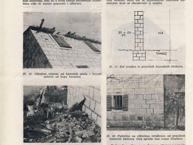 Tipične zgrade u selima i zaseocima koje su najviše oštećene ili urušene bile su prizemne kamene kuće na kamenim temeljnim zidovima zidanim u slabom vapnenom mortu i sa slabo popunjenim šupljinama između dvaju slojeva zida. Stropne konstrukcije su drveni grednici slobodno položeni i nepovezani sa ziđem. Krovišta su drvena od neuredno spajanih dijelova s teškim pokrovom od kamenih ploča ili kupa. Slabo povezani zidovi rasklapali su se tako da su najveći pomaci bili pri njihovu vrhu.
