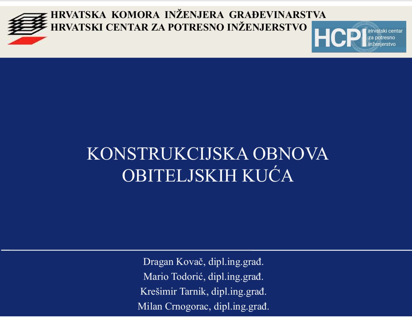 Primjeri projekata i prezentacije postupaka Prezentacija je održana sa svrhom edukacije projektanata vezano za obnovu zgrada u Sisačko moslavačkoj županiji. Poveznica:Prezentacija: Kovač, D.; Todorić, M.; Tarnik, K.; Crnogorac, M.: Konstrukcijska obnova obiteljskih kuća